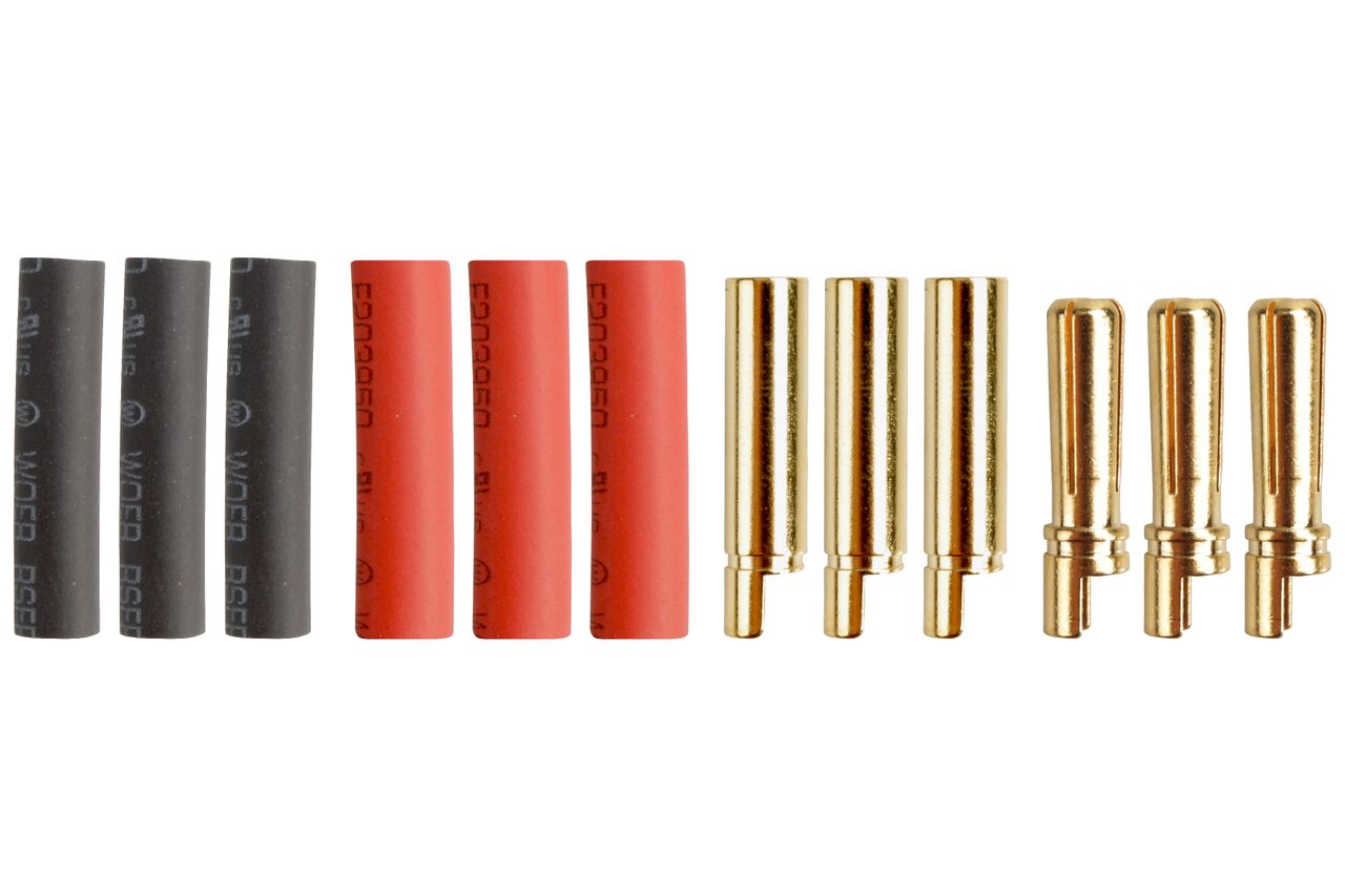 4mm Goldkontakte Stecker mit Schlitzfeder Lötkelch halboffen mit Schrumpfschlauch VE = 3 Paar