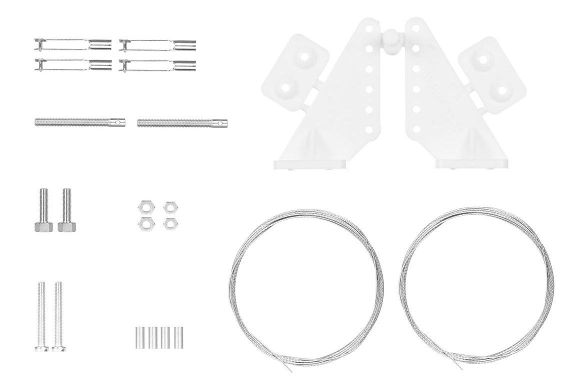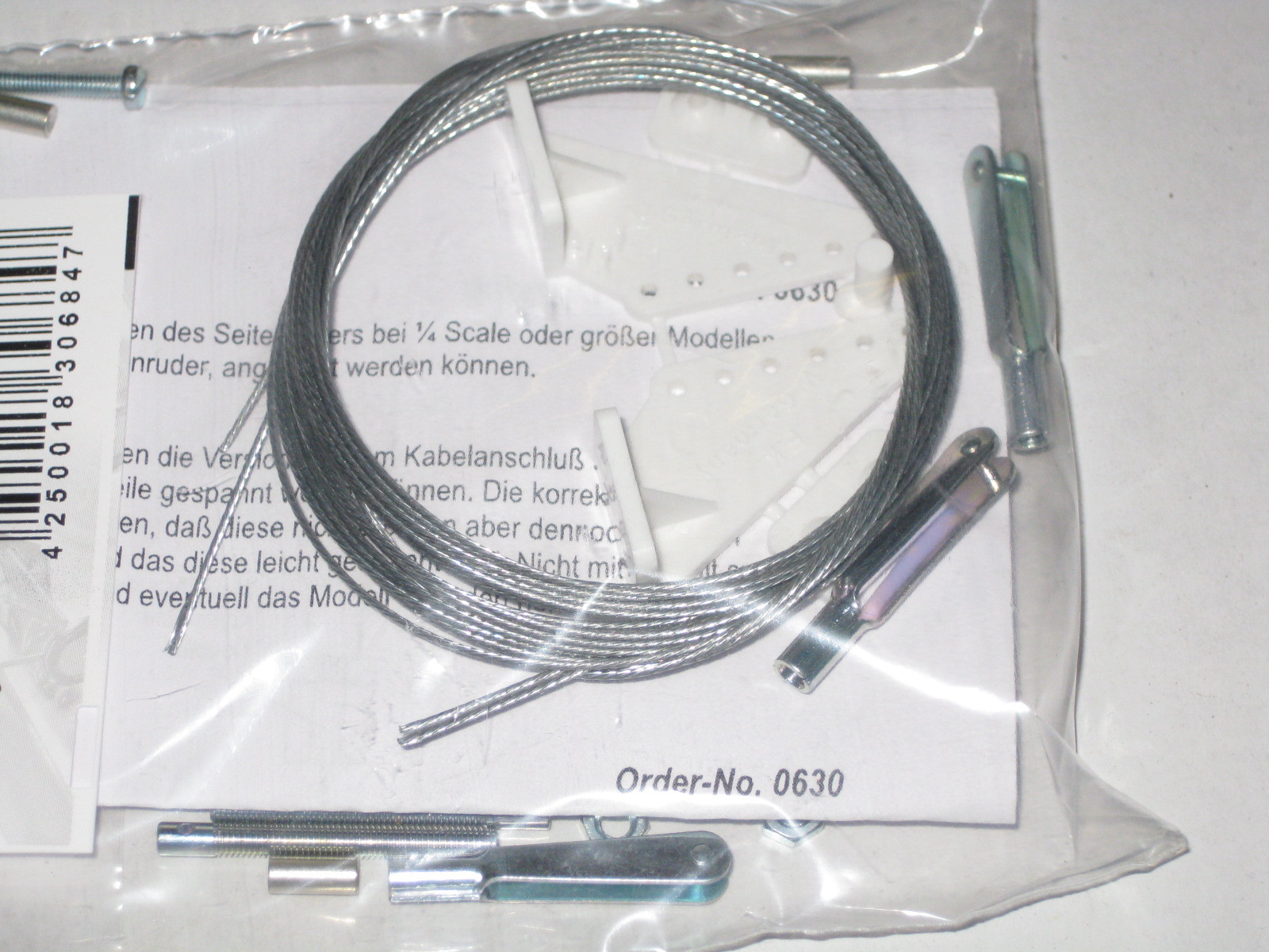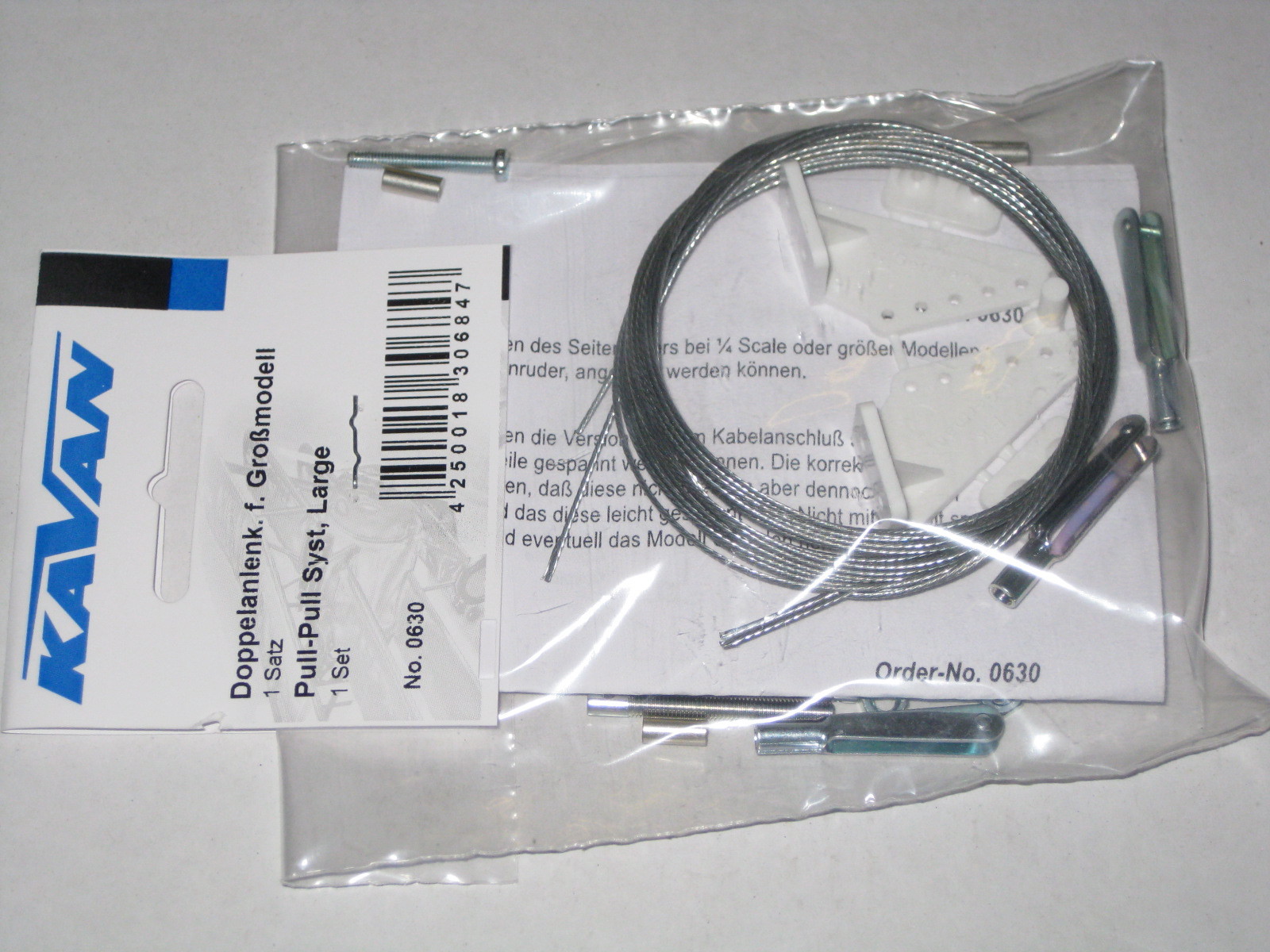 Leichte, exakte und sichere Verbindung zu Seiten- und Höhenruder bei Großmodellen. Das Set enthält 2x flexible verzinkte Stahllitzen, jede 2 m lang, 1x Ruderhorn-Set (Nr.0076), große Metall-Gabelköpfe, verstellbare Verbinder und Messingröhrchen.