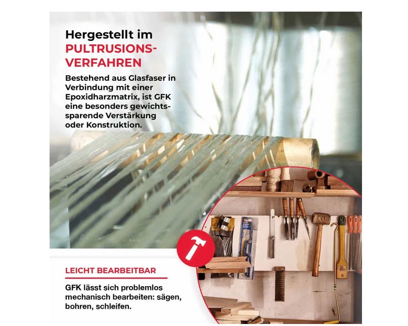 Das Material wird im Pultrusionsverfahren hergestellt und besteht aus Glasfasern, die mit einer Epoxidharzmatrix verbunden sind. Diese Fasern verlaufen unidirektional in Längsrichtung, was eine optimale Steifigkeit und Zugfestigkeit gewährleistet.