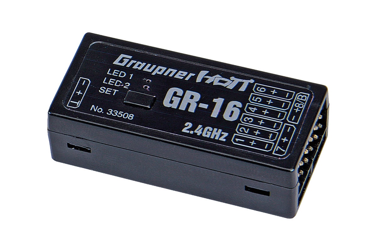 Der Graupner GR-16 HoTT Empfänger verfügt über ca. 4000m Reichweite und kann mit bis zu 8 Kanälen belegt werden.