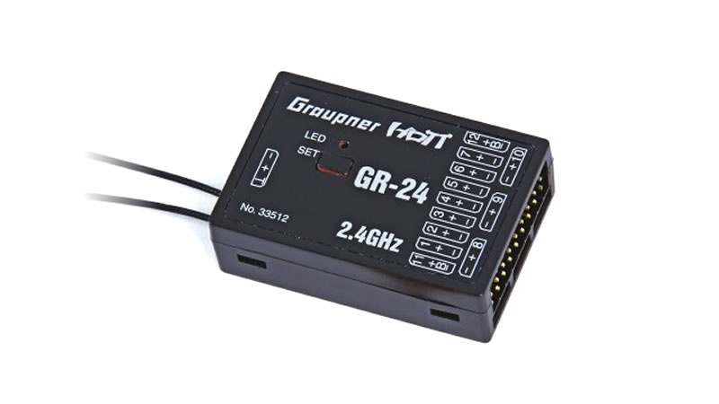 Der Graupner GR-24 HoTT Empfänger verfügt über ca. 4000m Reichweite und kann mit bis zu 12 Kanälen belegt werden.