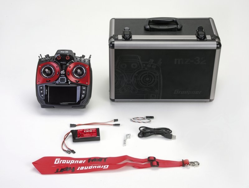 Lieferumfang • mz-32 HoTT Sender • 9000mAh LiHV Senderakku • Senderdisplay- und Programmierständer • USB-Kabel • USB-Adapter für Empfänger- und Sensor-Updates • Senderriemen • Alukoffer