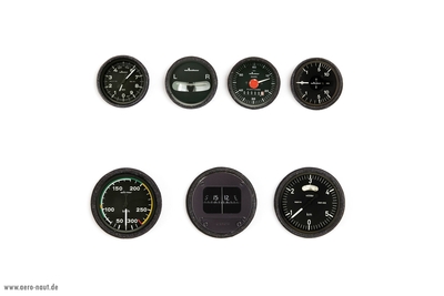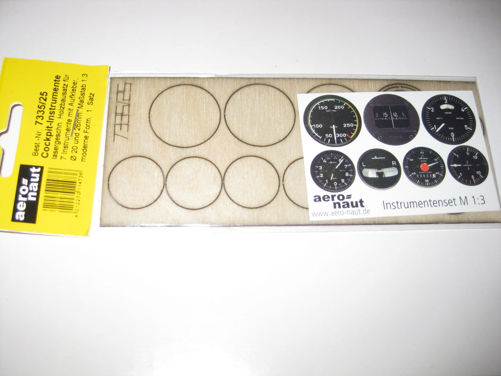 Einzelinstrumente für Flugmodelle, Bausatz aus Laserteilen. Ein Set bestehend aus insgesamt vier kleinen und drei großen Elementen und passenden Instrumenten als Aufkleber. Das Holz kann mit entsprechender Beize oder Lack vielfältig bearbeitet werden, um so z.B. Abnutzungsspuren oder Alterung zu simulieren.
