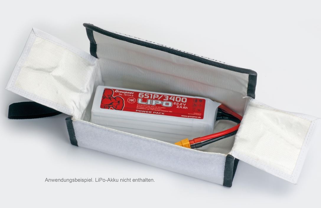 Sicherheitstasche zum Laden und Lagern von LiPo-/LiIo-/LiFe-Akkus. Die Tasche vermindert die schlimmsten Folgen bei einem Akkubrand und bremst die Ausbreitung der Flammen.