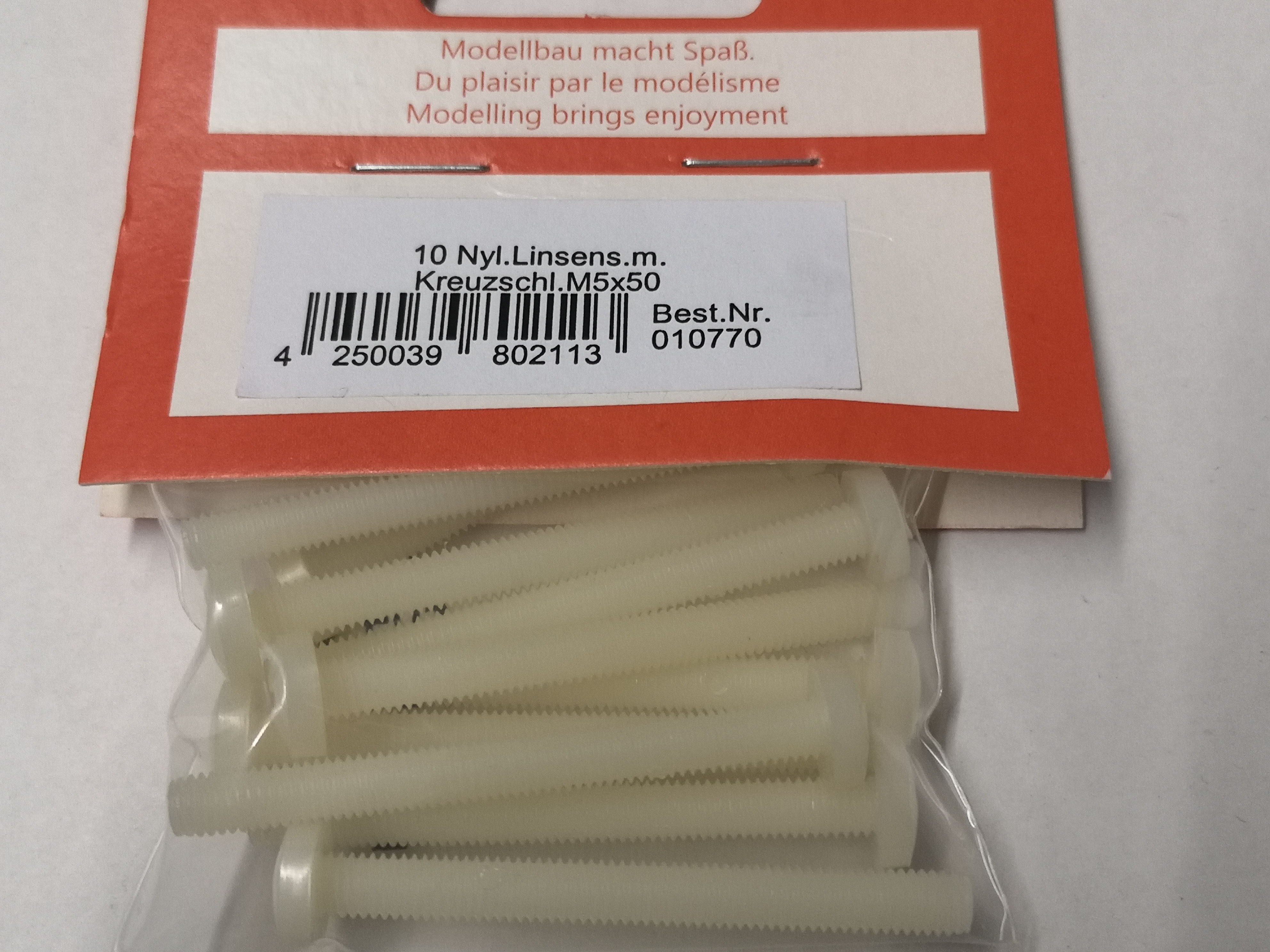Kunststoffschrauben M5 x 50mm Länge, Linsenkopf mit Kreuzschlitz.