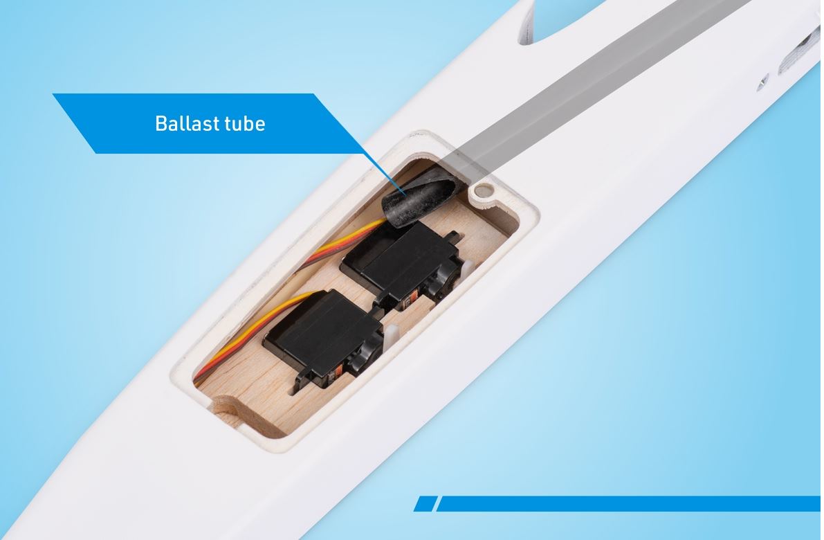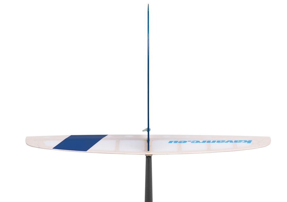 Das plane Leitwerk ist aus CNC-geschnittenen Balsateilen. Für einfachen Transport sind sie abnehmbar. Nach dem Einstecken auf Carbonfaser-Führungsstäbe werden sie mit einer Kunststoffschraube befestigt. Die Ruder werden mit Bowdenzügen angesteuert.
