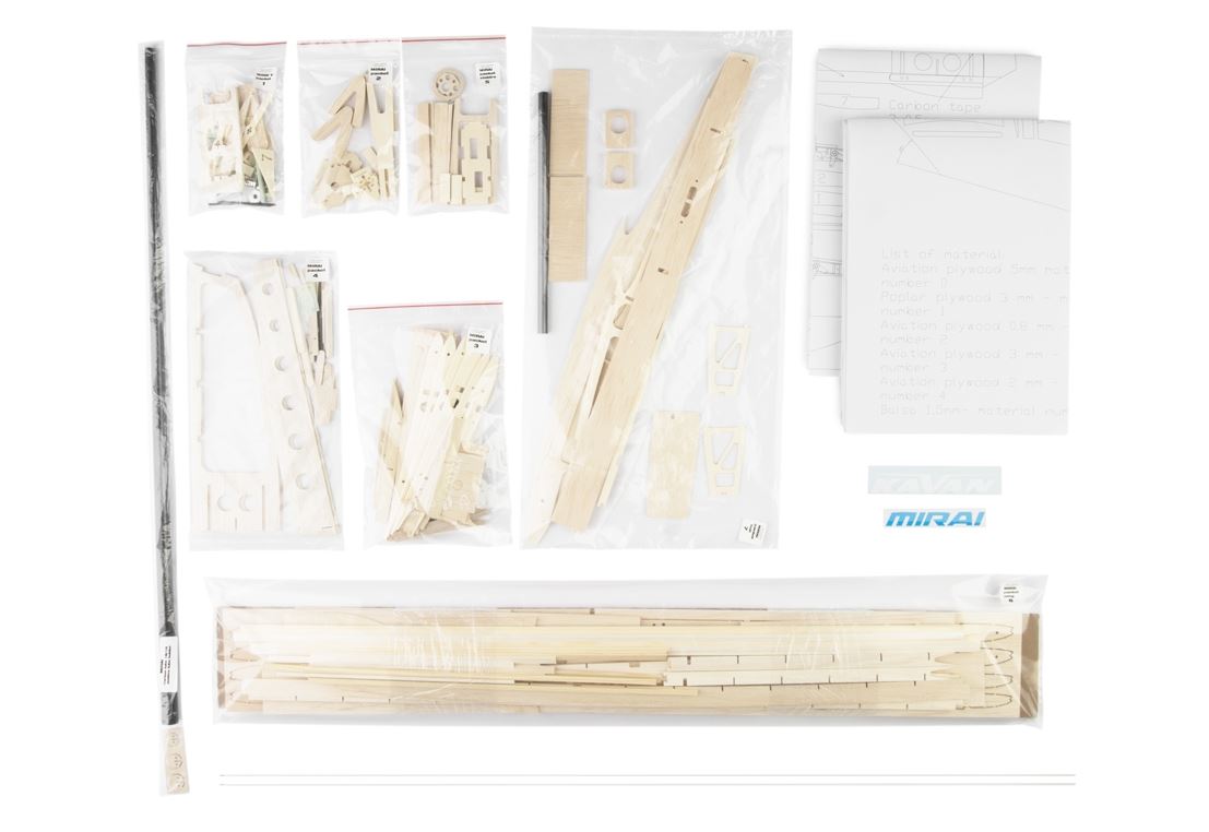 Der Baukasten beinhaltet: CNC geschnittene Balsa- und Sperrholzteile, Hauptholme und Balsabrettchen für die feste Beplankung, Carbonrohr-Leitwerksträger, Zubehör-Set, Druckbogen, Bauplan im Maßstab 1:1 und Bauanleitung.