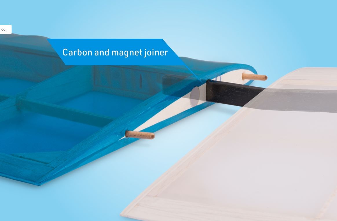 Der dreiteilige Flügel mit einem speziellen Profil HB RES hat eine klassische Konstruktion mit Balsarippen und mit einer festen Beplankung der D-Box in der Mitte. Der Hauptträger besteht aus Fichtenleisten-Streifen mit einer Balsa-Konstruktion, was eine hohe Festigkeit der Konstruktion bei einem sehr geringen Gewicht garantiert. Ohren mit eleganten Winglets schließen Sie an das Mittelteil mit Carbon-Verbindern und Buchenstiften mit Magneten als Sicherung an. In dem Mittelteil befindet sich eine zweiteilige Bremsklappe. – wir empfehlen, diese nicht wegzulassen, besonders wenn Sie einen „reinen“ Segler bauen. Gesteuert wird sie mit einem Servo mittels des Torsionsantriebs vom Kohlefaser-Stab mit Laminathebeln. Am Rumpf wird der Flügel mit Kunststoffschrauben befestigt.