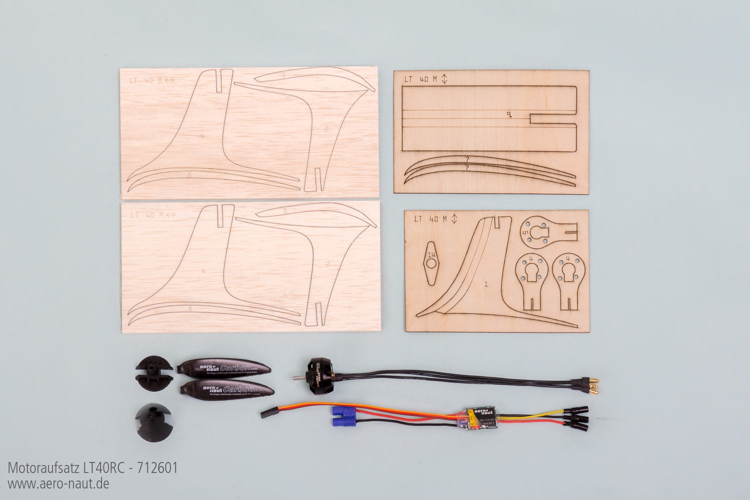 Mit dem Motoraufsatz wird der Lilienthal 40 RC zu einem vollwertigen Elektrosegelflugmodell. Damit kann das Modell auch ohne Hochstarteinrichtung in der Ebene geflogen werden. Der Motoraufsatz wurde aerodynamisch so gestaltet, dass Segelflug im Aufwind damit problemlos möglich ist. Die Kabelführung erfolgt im Inneren des Motoraufsatzes, sodass keine Kabel frei hängen und sauber in den Rumpf des Modells eingeführt werden. Der Bausatz besteht aus diversen Holzteilen, einem speziell für dieses Modell konfektionierten Brushless-Motor und Regler und einer Klappluftschraube mit Spinner. Ein Blattanschlag für den Klapppropeller liegt ebenfalls bei.