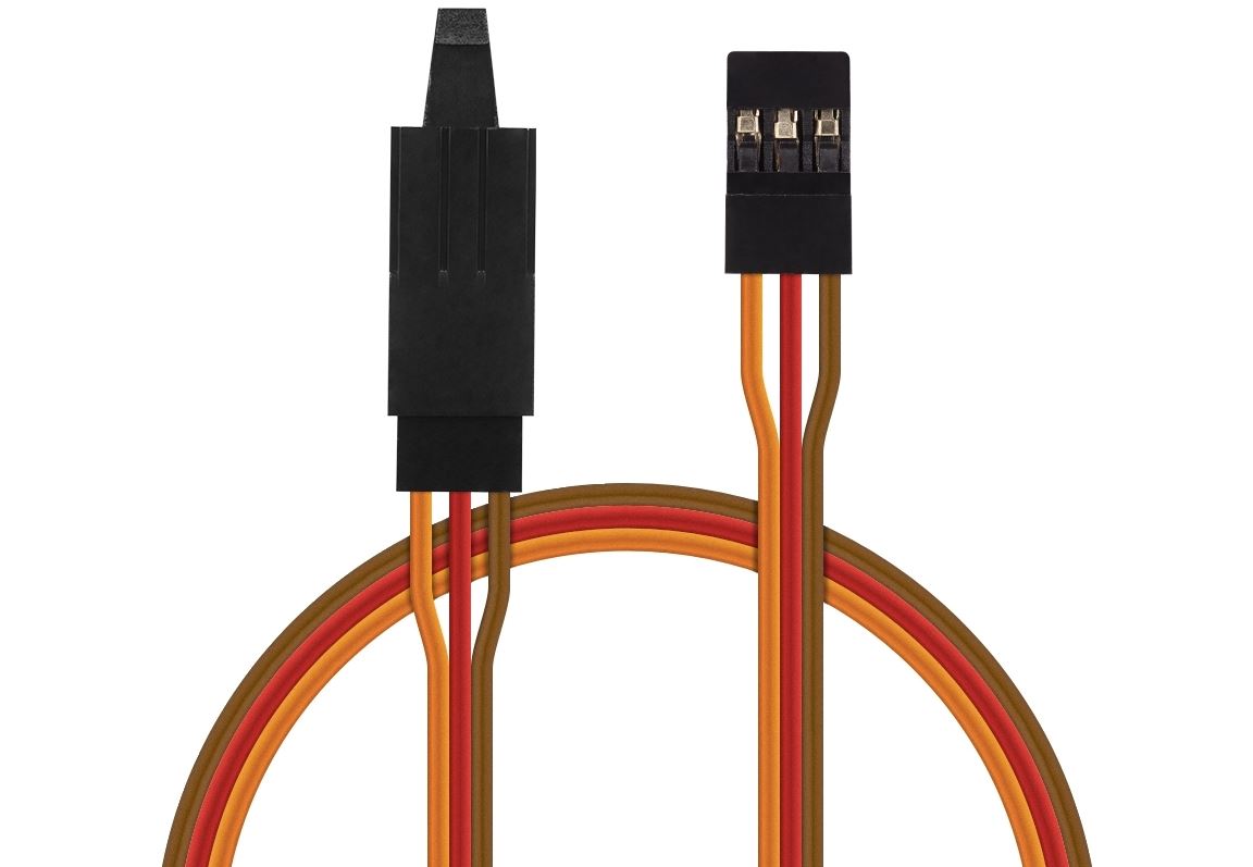 Flaches Verlängerungskabel mit JR Stecker in der Länge 900 mm mit PVC Isolation, Querschnitt des Kabels 0,25 mm2. Buchse (Gegenstück) ist mit einer Schnappsicherung versehen, um die Steckverbindung zu sichern.