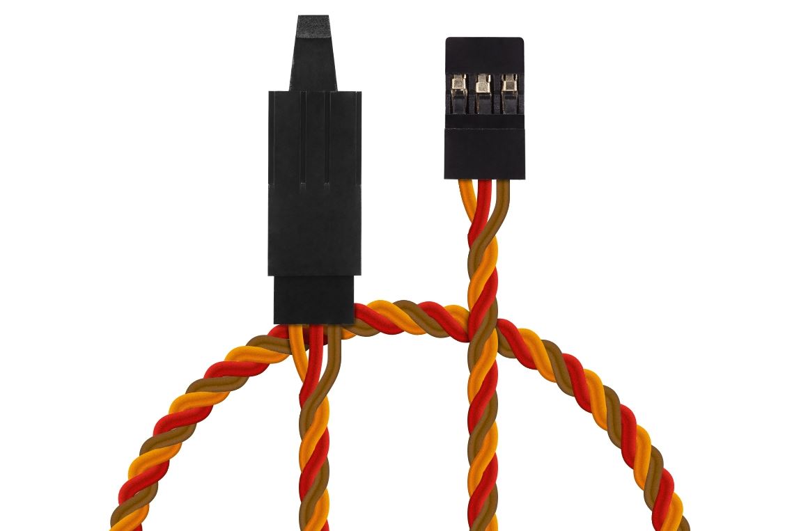 Gedrehtes starkes Verlängerungskabel mit JR Stecker in der Länge 600 mm mit PVC Isolation, Querschnitt des Kabels 0,25 mm2. Buchse (Gegenstück) ist mit einer Schnappsicherung versehen, um die Steckverbindung zu sichern.